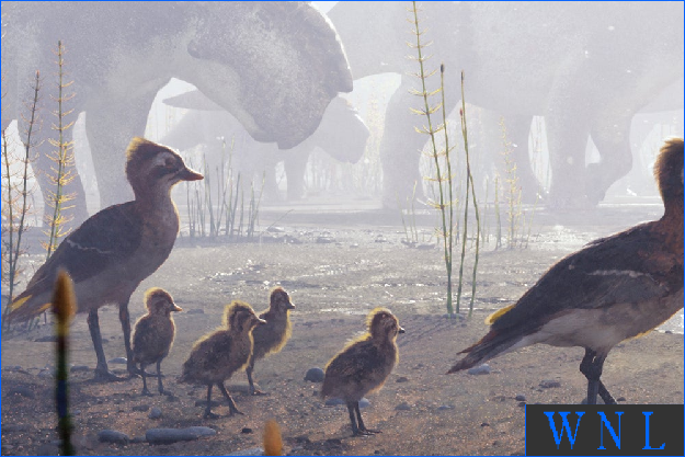 How Birds Began Migrating to the Arctic to BreedNEWS | 07 October 2025A breeding pair of ornithurine birds and their hatchlings survey the coastal floodplain. These birds shared this landscape with dinosaurs, such as the Pachyrhinosaurus herd in the background. 73 million years ago in what is now northern Alaska.